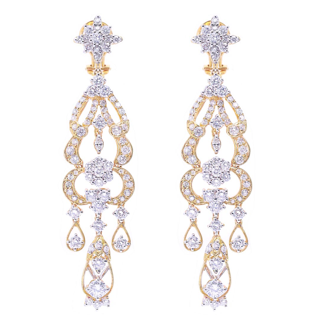 Classic diamond earrings which always evoke beauty and romance, and this eye-catching pair of vintage gold earrings is no exception. The stunning, intricate setting brings out the natural sparkle of the ravishing conflict-free diamonds.