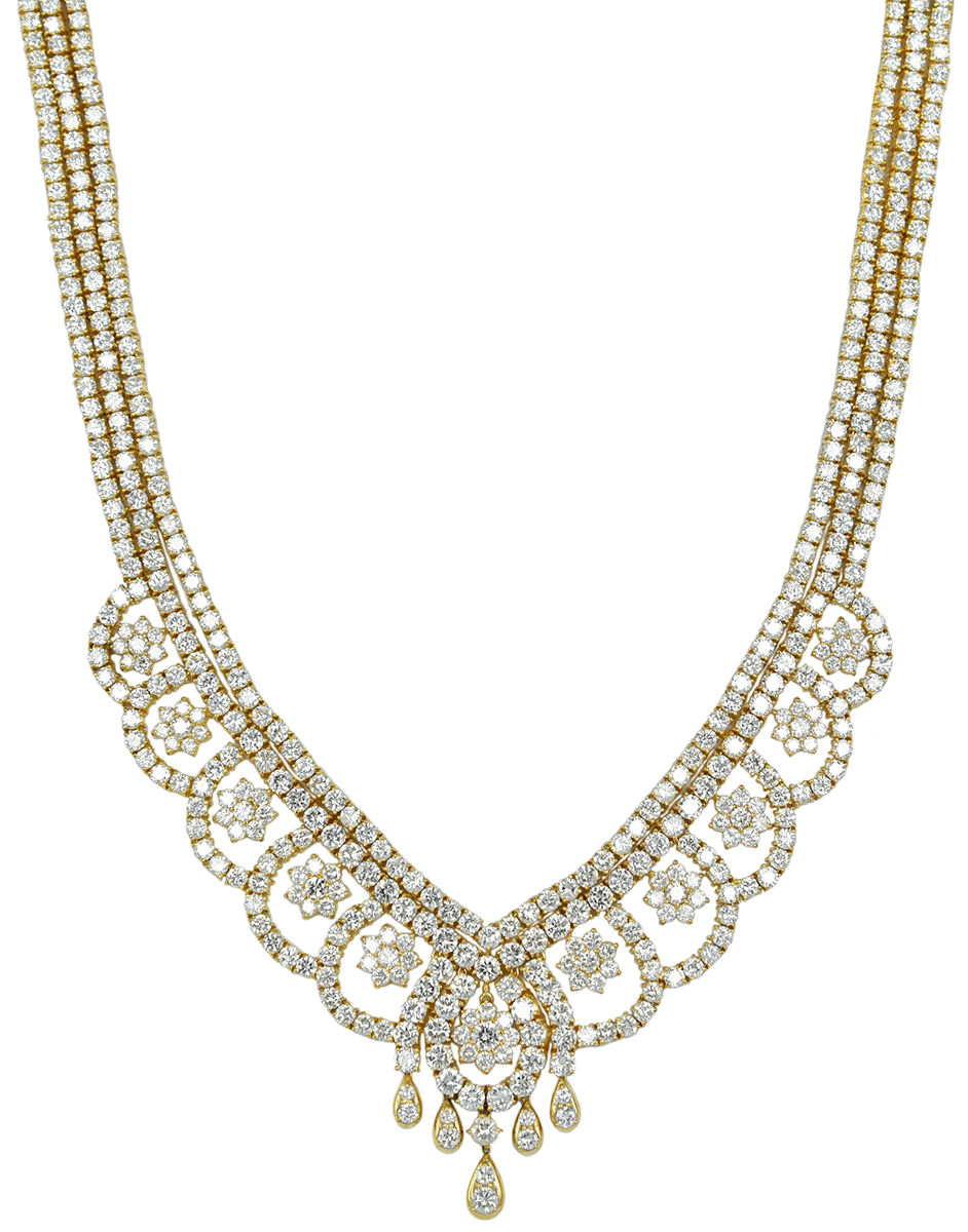 A unique silhouette, this 18kt yellow gold necklace is a real eye catcher. The clear round diamonds embedded in a floral design are beautifully placed on this classic piece, giving it an elegant, dynamic feel.